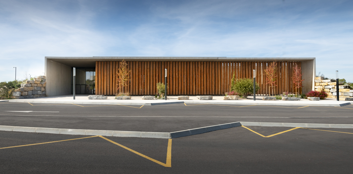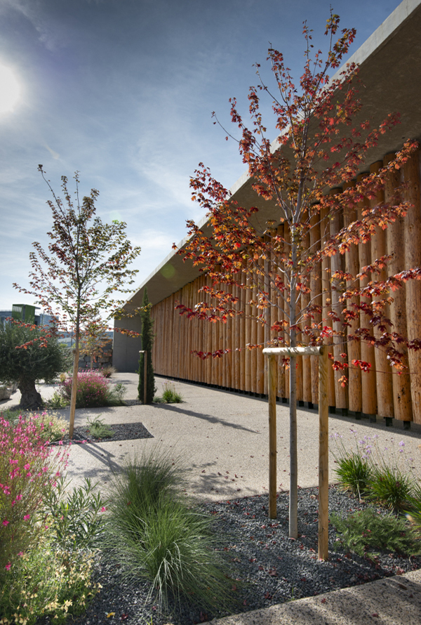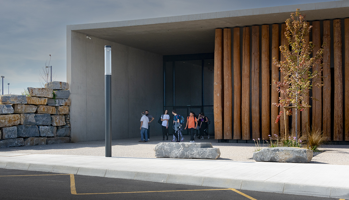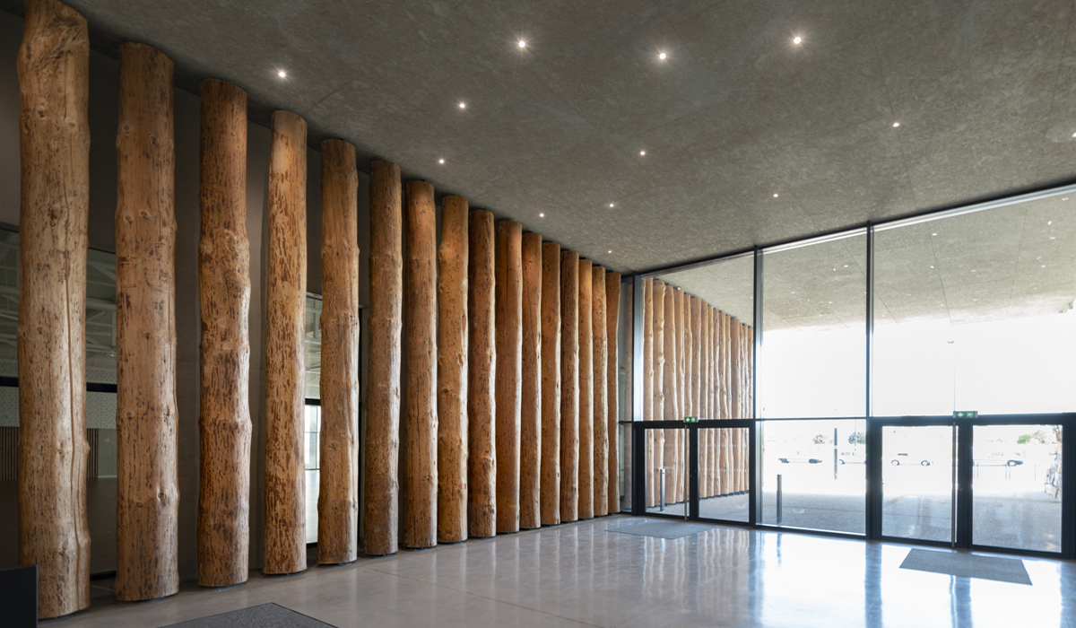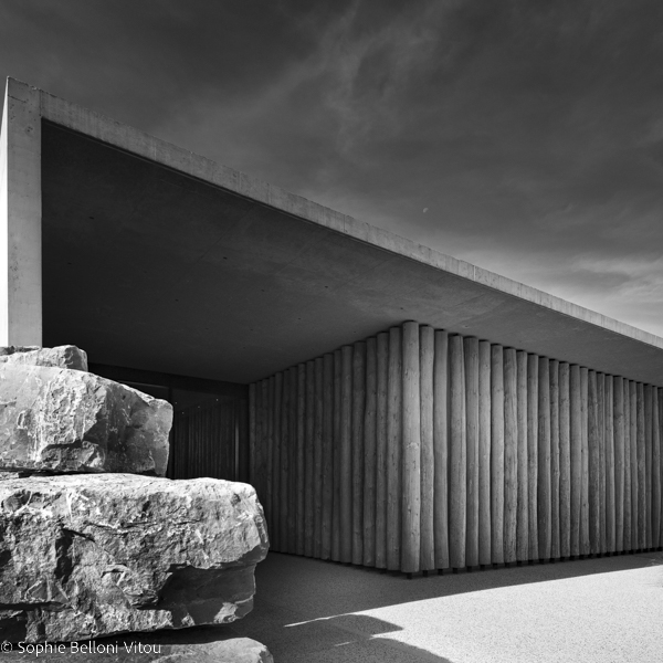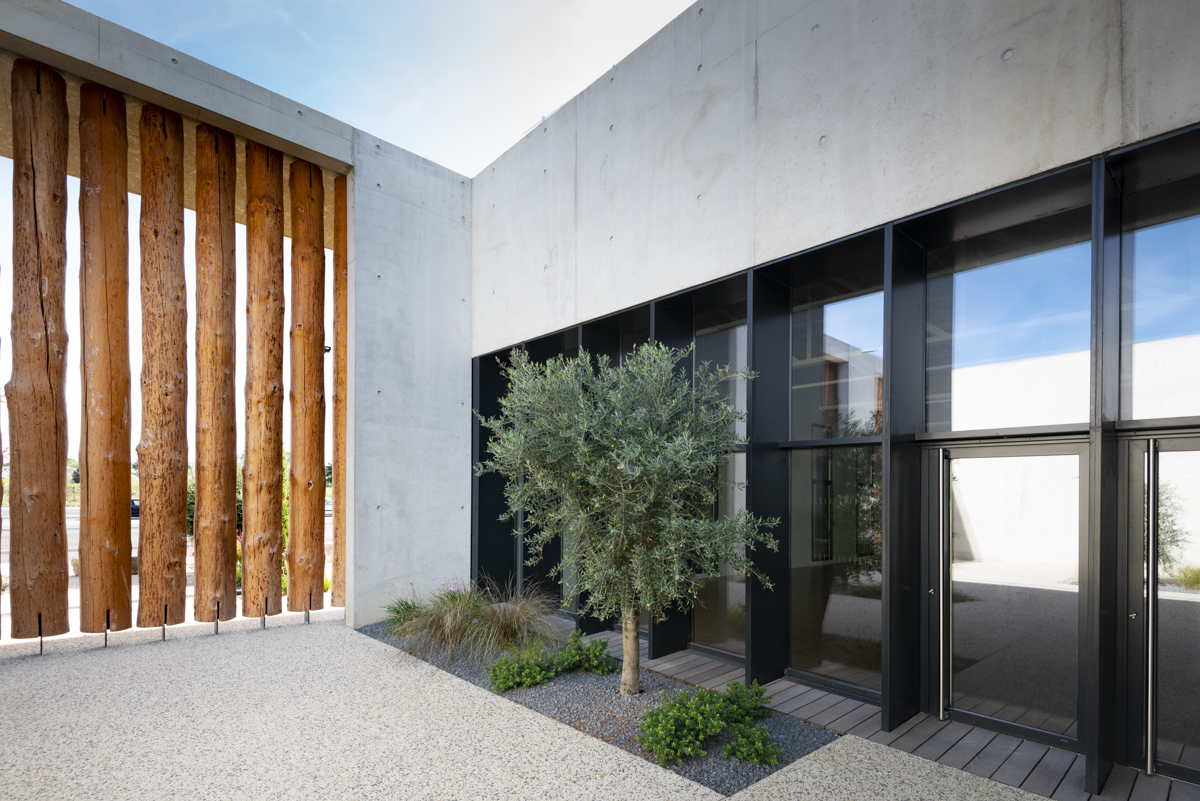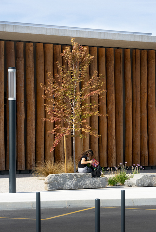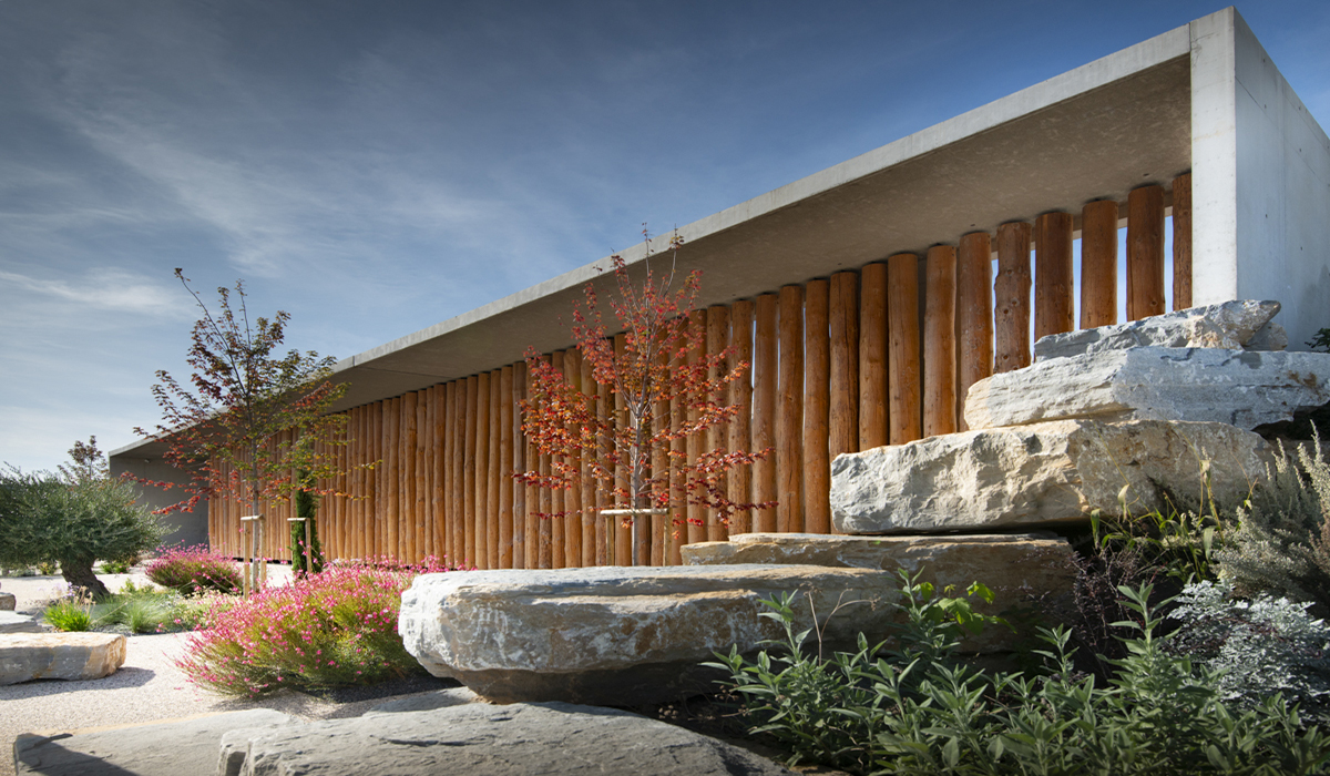 La matérialité célèbre la sobriété du lieu- béton, pierre et bois massif- et trouve son point d’orgue dans une façade de troncs de Douglas, écorcés à la main, comme une forêt apprivoisée.