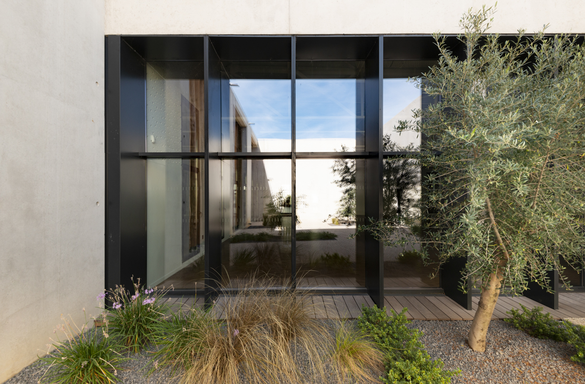 Pensé pour le confort et la lumière, le bâtiment respire: patio, auvent, protecteur, et ventilation naturelle accompagnent les usages quotidiens.